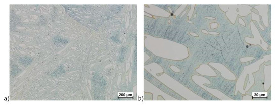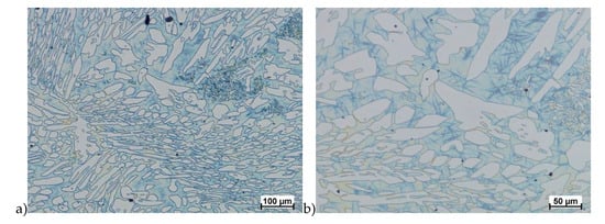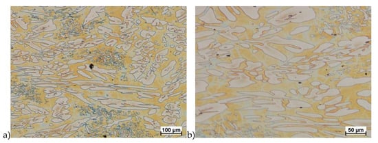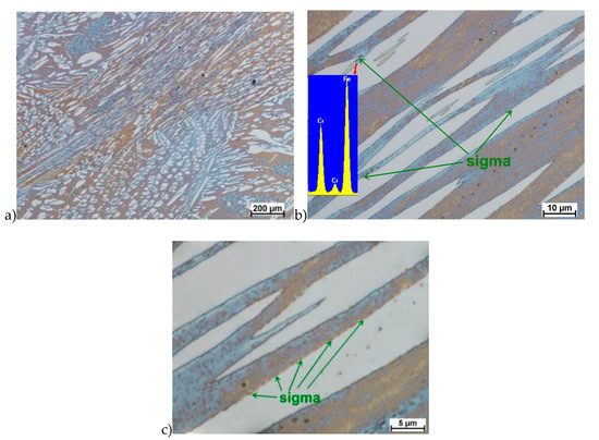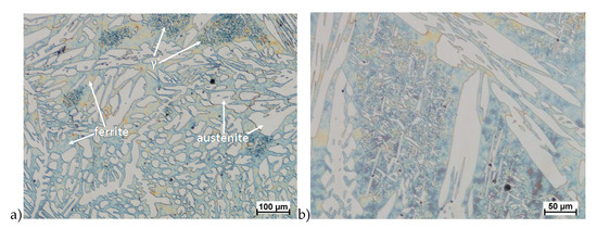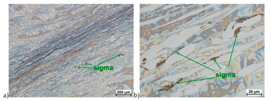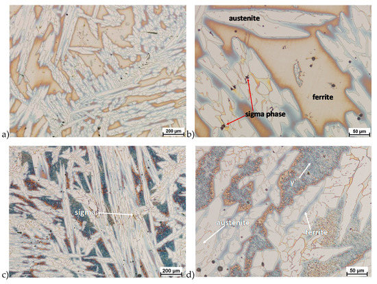 The structure of materials were analyzed with use of the light microscope and the phase content was determined using the Nis-Elements D application. The evaluation of the raw state microstructure showed that the material was characterized by presence of ferritic–austenitic grains with a small presence of 2%–2.5% of the σ phase. According to literature study [5,14,18,19,28,29,30] and the authors’ research [2,10,17,31], this phase volume was not harmful.