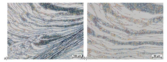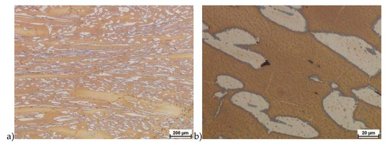 Microstructure of the X2CrNiMoCuN25-6-3 deformed according to the variant 14a. a) magn. 100×, b) 200×.