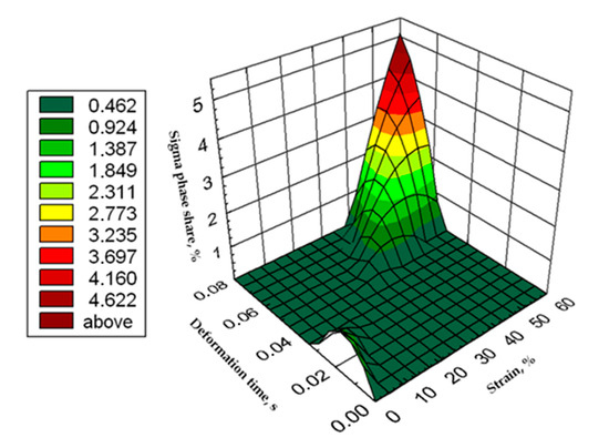 Based on the tests, was possible to develop the relationship of the percentage share of phase σ as a function of time and strain in the form of an equation and the surface shown in Figure 16.
