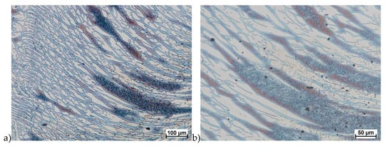 Microstructure of the X2CrNiMoCuN25-6-3 deformed according to the variant 15a. a) magn. 100×, b) 200×.