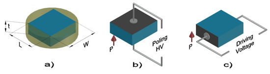 - Brissaud, M. Modelling of coupling between shear and longitudinal modes of a bulky rectangular piezoelectric element. Mat. Res. Express 2019, 6, 095701. [Google Scholar] [CrossRef]