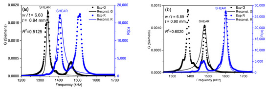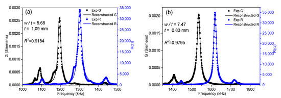 Similarly, for the spectrum of Figure 4b, both characteristic frequencies of the shear mode are well determined automatically by the software. Another lateral mode is excited at ≈1700 kHz. The maximum of G for the shear mode is also higher than the maximum of G for this lateral mode and fs is also correctly determined. It is clear, by the shape of the reconstructed spectra and the low values of , that the two spectra in Figure 4 are not optimal for the material characterization; however, the calculated coupling factors from them (marked with (*) in Figure 3b), though affected by coupling, are not absurd, as the frequencies needed for the iterative analysis can be automatically determined.