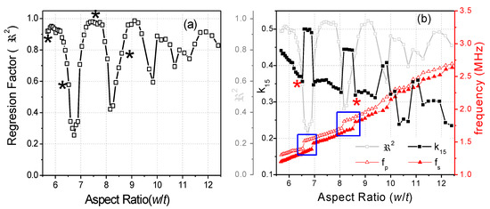 Evolution as a function of the aspect ratio of the BCZT plate: (a) of the reconstructed to the experimental resonance spectra regression factor, , (the points marked with (*) correspond to the spectra of Figure 2, which are examples of uncoupled shear modes with high , and Figure 4, examples of coupled modes with low ) and (b) of the frequencies fp and fs and the electromechanical coupling factor, k15; squares indicate anomalies in the difference (fp − fs).