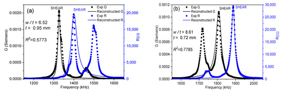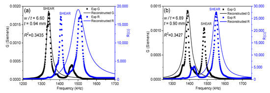 In between the aspect ratios that result in spectra like those in Figure 4, e.g., at the first valleys of the plot of Figure 3a, for 6.52 < w/t < 6.96 and 8.05 < w/t < 8.61, we measured the spectra as shown in Figure 5. The spectrum in Figure 5a is characterized by double peaks of R, when the shear frequency approaches the frequency of the lateral mode. The height of the R peak corresponding to the shear mode is lower than that corresponding to the lateral mode until the frequency of the shear resonance surpasses that of the lateral mode, as in Figure 5b. As the aspect ratio increases, the spectrum becomes like the one shown in Figure 5b, characterized by double peaks of G. At this point, the height of the G peak corresponding to the shear mode is lower than that corresponding to the lateral resonance. This leads to the incorrect automatic determination of the frequencies fs and fp and overestimation of the difference (fp − fs), as marked in Figure 3b. Consequently, the corresponding k15 coupling coefficient is also overestimated and other coefficients also have anomalies [17].
