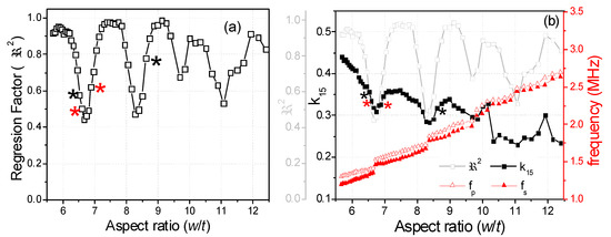 Evolution as a function of the aspect ratio of the BCZT plate: (a) of the regression factor, , reconstructed to the experimental shear resonance spectra (the points marked with (*) correspond to the spectra of Figure 4 and Figure 6, which are examples of coupled modes with low (black) and very low (red) , respectively) and (b) of the frequencies fp and fs and the electromechanical coupling factor, k15; all parameters of coupled modes were recalculated by the modified automatic iterative method.