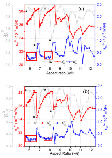 Therefore, when the characteristic frequencies of the shear mode are correctly determined by the modified method, there is no artifact affecting the evolution of the calculated compliance s55E with the aspect ratio (w/t). Abrupt jumps in the recalculated compliance (real part) from a maximum to a local minimum are shown in Figure 8b. These jumps take place in parallel to the jumps in the frequencies of the shear mode over those in each lateral mode, at the minima of the periods. From each jump to the next, the recalculated compliance s55E increases as the frequency of the shear mode increases. Since the material coefficient s55E′ is inversely proportional to the fp of the shear mode, this is the result of the overall modification of the spectrum near coupling (Figure 6), which limits the use of Equation (4). Unless we know if the aspect ratio of the measured plate is moving away from or coming closer to the nearest one for a coupled mode at minima, it is not possible to know if the calculation is underestimating or overestimating s55E′. The deviation from the material coefficient, calculated at maxima, can be estimated as ±4% by looking at the second period in Figure 8b (7 < w/t < 8).