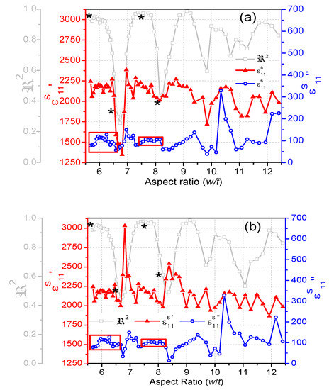 When the characteristic frequencies were not correctly determined, anomalously low values of the real part of the permittivity (Figure 9a) were calculated for spectra showing very low (Figure 5). By using the modified method, we obtain a narrower range for the aspect ratio of the anomalies in the real part of ε11S (Figure 9b), but still obtain a broad dispersion of the real part of the permittivity value, due to the changes in the shape of R and G curves in the shear mode, when dispersion takes place near the lateral modes (Figure 6).