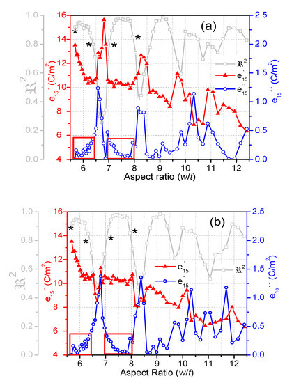 Evolution of the complex piezoelectric coefficient e15 as a function of the aspect ratio of the BCZT plate; the real and the imaginary parts (e15′ and e15″) are both plotted: (a) calculated by the automatic iterative method; (b) recalculated by the modified automatic iterative method. The evolution of is shown as a reference.