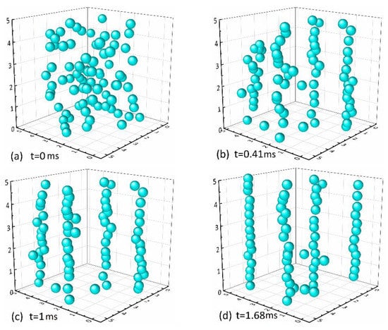 The three-dimensional distribution of the chain-forming process of magnetorheological fluid (MRF) at (a) 0 ms, (b) 0.41 ms, (c) 1 ms and (d) 1.68 ms under the magnetic field.