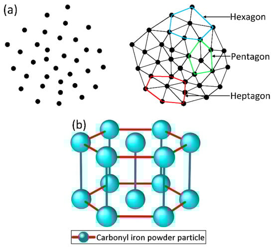 It can be seen from Figure 2a that each point can be regarded as a chain of CIP particles. By triangulation, randomly distributed CIP particle chains in the direction perpendicular to the magnetic field forms pentagons, hexagons, or heptagons. Among which, the hexagons are the majority. This situation is more evident in high concentration MRFs. Accordingly, the irregular polygon is simplified to regular a hexagon to facilitate the calculation. Thus, in this work, the hexagonal close-packed structure is proposed. Figure 2b is the schematic drawing of the hexagonal close-packed structure. In this structure, each CIP chain has six adjacent chains and the distance between two chains is equal. The distance between adjacent chains is greatly affected by the volume fraction of CIP particles: the distance decreases with increasing volume fraction and it increases with decreasing volume fraction. In each chain, the magnetic dipole is impacted by other magnetic dipoles in this and adjacent chains. On this basis, the constitutive model of MRFs is to be constructed in this work. The salient feature of this method is to take a single chain as a unit [26] and then consider the influence of adjacent chains to adapt the hexagonal close-packed structure to the concentration change of MRFs.