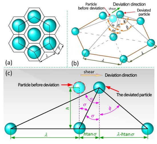 (a) The overall structure for the close-packed unit particles; (b) Angles between the offset magnetic dipole i and the contiguous magnetic dipoles in the vertical direction; and, (c) Angles between the front and rear magnetic dipoles and the offset magnetic dipole along shear direction.