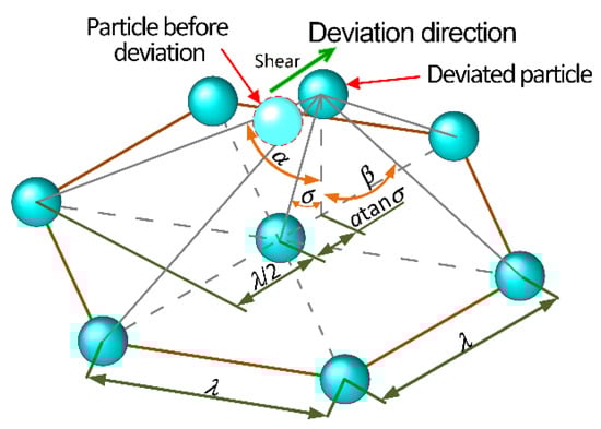 where, Ei2 and Ei3 represent, respectively, the magnetic energy along the shear direction produced by the magnetic dipole, which is far from and closer to the magnetic dipole i after deviation under the shear action, Ei4 and Ei5 represent, respectively, the magnetic energy along the shear direction produced by the magnetic dipoles on both sides, which are far from and closer to the magnetic dipole i after deviation under the shear action. It is noted that the magnetic dipole only moves along the shear direction. As expressed in Figure 4b, ω and ϕ represent the angle between the offset magnetic dipole i and the far and close magnetic dipole in the vertical direction, while β and α separately denote the angle between the offset magnetic dipole i and the far and close magnetic dipoles on both sides in the vertical direction.