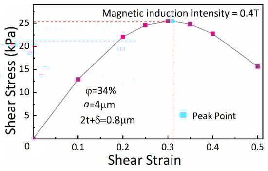 The shear yield stress of material is the maximum shear stress to resist deformation, which is reflected as the maximum stress point on the shear stress-strain curve. For MRFs, it is considered that the chain structure reaches its maximum deformation under the maximum shear stress. This group of experiment simulates the relationship between the shear stress and strain taking the strain as variable while the other factors unchanged. Figure 6 depicts the shear stress-strain relationship of MRFs in view of its chain structure. This result tells the point of maximum shear stress and the corresponding strain with a value of 0.31. The trend of the shear stress-strain relationship of other volume fraction of CIP particles, such as 25% and 40%, is also the same as the experimental result of 34%; the strain is almost often 0.31 when the shear stress reaches its maximum. Therefore, the shear stress is taken as the shear yield stress of MRFs in the subsequent experiments when the shear strain is 0.31.