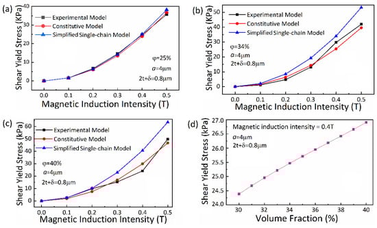 From Figure 7a–c, it is validated that the constitutive model constructed in this work well fits the trend of the shear yield stress as a function of the magnetic induction intensity. The saturation point of the shear yield stress moves backward with the increasing volume fraction of CIP particles, which is consistent with the previous research. Additionally, it is obviously seen from Figure 7b,c that the simulation of single-chain model to high concentration MRFs is not good showing relative larger error than the proposed constitutive model. It is remarked that the constitutive model that was built in this work can predict the shear yield stress well under magnetic saturation of MRFs, which is, in general, hard to achieve from experimental tests.