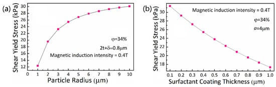 Generally, the layer of surfactant coated on the CIPs is taken as even and the thickness of surfactant coating is regarded as an invariant for simplifying the calculation and facilitating the simulation [35]. In fact, with the increase of the surfactant volume fraction, the thickness of surfactant-coated particles increases. It is noted that when the surfactant volume fraction increases to a certain level, the coating thickness will stop increasing and the rest surfactant will have a negative influence on the properties on MR fluids. Therefore, an optimum volume fraction of surfactant is of great significance. The coating thickness is used to express the amount of surfactant that is adsorbed on or around the CIP particles. In this group of experiments, in the circumstances of other variables keeping invariant, the surfactant volume fraction is enhanced in order to thicken the surfactant coating. Subsequently, the thickness change of surfactant coating with MRFs shear yield stress is simulated and shown in Figure 8b. It is seen that the shear yield stress slowly decreases with an increasing surfactant coating thickness. This is attributable to the increscent distance between CIP particle centers that results from the increase of surfactant coating thickness. Although the surfactant takes up a small proportion in MRFs, it has great influence on the sedimentation stability. The sedimentation ratio of particles in MRFs decreases with the increase of surfactant coating thickness, which further leads to the reduction of MRFs shear yield stress. Through practical experience, the surfactant coating of CIP particles after reaching a certain thickness usually no longer increases. Therefore, the surfactant volume fraction should be selected based on that of the CIP particles, not being too large.