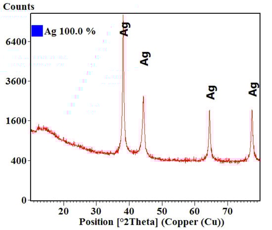 It was observed that the interferences of the powder corresponded to pure phase cubic silver. The spectra presented diffraction peaks for the defined Miller indices planes (111), (200), (220), (311), in accordance with the American Society for Testing and Materials (ASTM) sheet for silver (ICDD PDF4+ 00-004-0783). The degree of crystallinity of the sample is evident by the intensity of the diffraction lines. The crystallite size was also calculated using the Scherrer formula; the obtained average crystallite size was 21.60 nm.