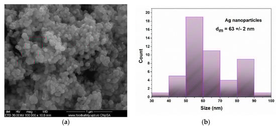 In Figure 2, the structure and size of the nanoparticles are analysed. The nanoparticles are in agglomerated powder. The particles presented almost spherical shapes, which are known for their antimicrobial activity. As seen in the particle size distribution graph, the mean particle size was 63 +/− 2 nm. The nanoparticles were also distributed bimodally with a maxima at around 55 nm and 85 nm.