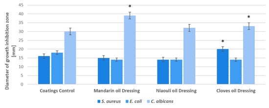 Evaluation of growth inhibition zone for S. aureus, E. coli and C. albicans in the presence of the developed wound coatings: Coatings Control—dressing modified with silver NPs, Mandarin oil Dressing—dressing modified with silver NPs and mandarin EO, Niaouli oil Dressing—dressing modified with silver NPs and niaouli EO, Clove oil Dressing—dressing modified with silver NPs and clove EO. * p < 0.05 (control coatings vs. NPs and EOs coated samples for each strain).