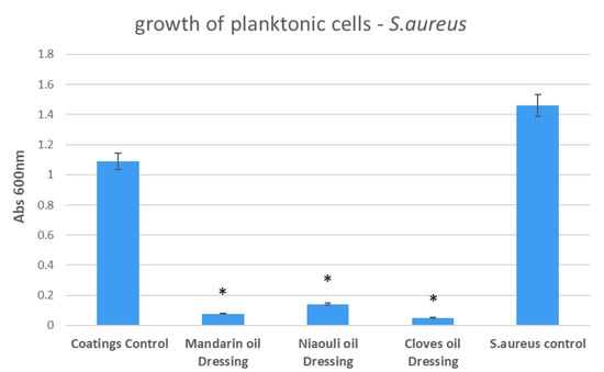 Growth of planktonic cultures of S. aureus in the presence of wound dressings coated with EOs functionalized silver nanoparticles (NPs). Coatings Control—dressing modified with silver NPs, Mandarin oil Dressing—dressing modified with silver NPs and mandarin EO, Niaouli oil Dressing—dressing modified with silver NPs and niaouli EO, Clove oil Dressing—dressing modified with silver NPs and clove EO. * p < 0.05 (control coatings vs. NPs and EOs coated samples for each strain).