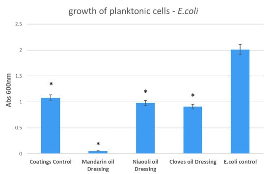 Growth of planktonic cultures of E. coli in the presence of wound dressings coated with EOs functionalized silver nanoparticles (NPs). Coatings Control—dressing modified with silver NPs, Mandarin oil Dressing—dressing modified with silver NPs and mandarin EO, Niaouli oil Dressing—dressing modified with silver NPs and niaouli EO, Clove oil Dressing—dressing modified with silver NPs and clove EO. * p < 0.05 (control coatings vs. NPs and EOs coated samples for each strain).