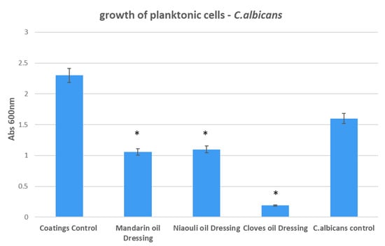 Growth of planktonic cultures of C. albicans in the presence of wound dressings coated with EOs functionalized silver nanoparticles (NPs). Coatings Control—dressing modified with silver NPs, Mandarin oil Dressing—dressing modified with silver NPs and mandarin EO, Niaouli oil Dressing—dressing modified with silver NPs and niaouli EO, Cloves oil Dressing—dressing modified with silver NPs and clove EO. * p < 0.05 (control coatings vs. NPs and EOs coated samples for each strain).