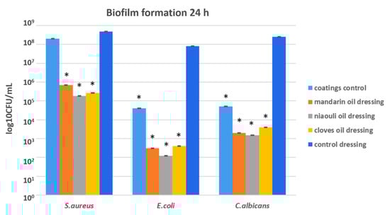Biofilm formation in the presence of tested nanocoatings coatings control = microbial cells attached to the coatings control-dressing modified with silver NPs. Mandarin oil dressing = microbial cells attached to the mandarin dressing modified with silver NPs and mandarin EO. Niaouli oil dressing = microbial cells attached to the niaouli dressing modified with silver NPs and niaouli EO. Clove dressing = microbial cells attached to the cloves dressing modified with silver NPs and clove EO. Control dressing = microbial cells attached to the commercial wound dressing (containing silver NPs and EO free). * p < 0.05 (control coatings vs. NPs and EO coated samples for each strain).