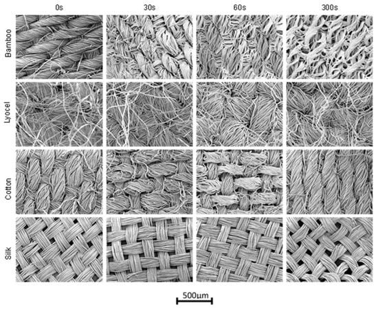 Based on these findings, the bamboo, cotton, lyocel and silk will be treated for 30 seconds, 300 seconds, 60 seconds and 30 seconds, respectively, in the following sample production.