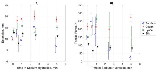 (a) Breaking force of fabric samples as a function of time in sodium hydroxide. (b) Elongation at breaking force.