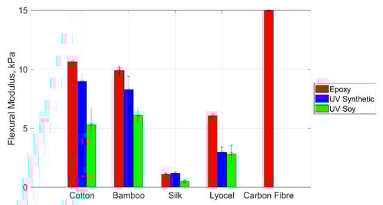 Comparison of the flexural modulus of samples produced using different resin and matrix types. Range bars are presented based on measurements from all samples in that class, e.g., the average and range bars on the epoxy cotton data are based on measurements of both repeats of both weave directions with and without sodium hydroxide treatment, representing eight samples.