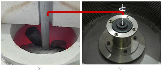 The reinforcing component in the form of silicon carbide particles (Figure 2) was introduced to modified aluminum alloy using the well-known stir casting method numbered, for many years now, among economically viable liquid-phase PMMCs fabrication methods [33,34,35,36]. The technological process was carried out on a PTA200/PrG station as per an original procedure developed by the present authors and described in detail in previously published papers [10,34,37]. The prepared composite suspension of 10 wt % of SiCp in AlSi12 was cast to graphite forms to obtain a half-product for the subsequent formation of a composite sleeve in the centrifugal casting process. In the next step, composite ingots were melted in a crucible furnace (Figure 3a), which is an integral part of the technological process station MVO500 [38], the design of which enabled tapping the liquid composite suspension directly to a centrifugal mold rotating in the vertical axis system (Figure 3b).