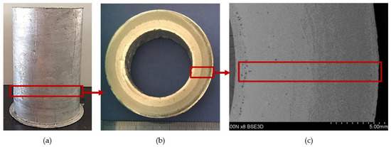 The selection of proper material parameters such as the reinforcement particles size and type (Figure 2) and matrix alloy chemical composition (Table 1), as well as parameters of the centrifugal casting process in the vertical axis (i.e., the composite suspension pouring temperature as well as the temperature, diameter, and rotational speed of the centrifugal mold, cf. Table 2) enabled making castings in the form of sleeves with an outer composite layer with a thickness of about 6 mm distinctly visible on the cross-section of the casting (Figure 4). Selected model issues concerning the formation of a functional structure in metal–ceramic composites in the centrifugal casting process were already presented in [24].