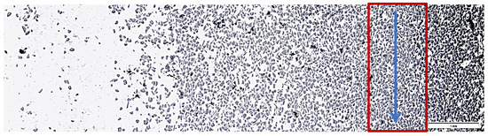 LM microstructure of reinforcing particles distribution on a cross-section of the tested AlSi12/SiCp composite layer; unetched section. The blue arrow indicates the area and direction of the scratch test.