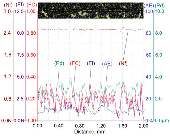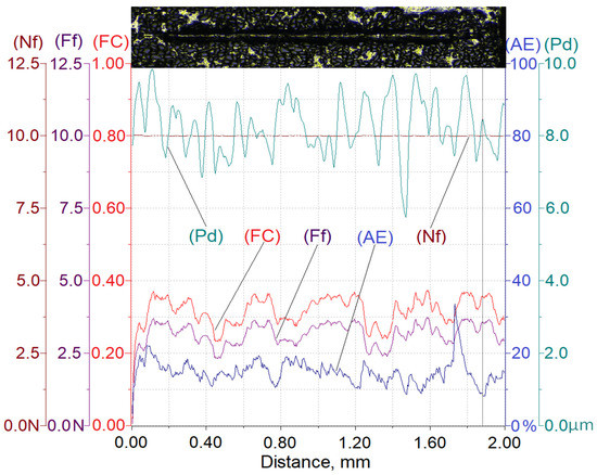 In turn, Table 3 summarizes the ranges of variability and average values of penetration depth (Pd), friction force (Ff), friction coefficient (FC), and acoustic emission signal (AE) recorded in the course of making a scratch on the composite specimens under load forces of 2.5 N, 5 N, or 10 N.