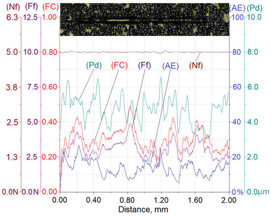 Results of AlSi12/SiCp composite layer scratch testing for the normal load force Nf = 2.5 N; Nf—normal force, Pd—penetration depth, Ff—frictional force, FC—friction coefficient, AE—acoustic emission.