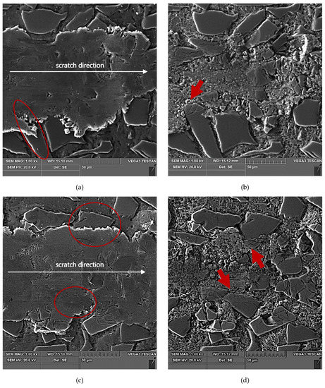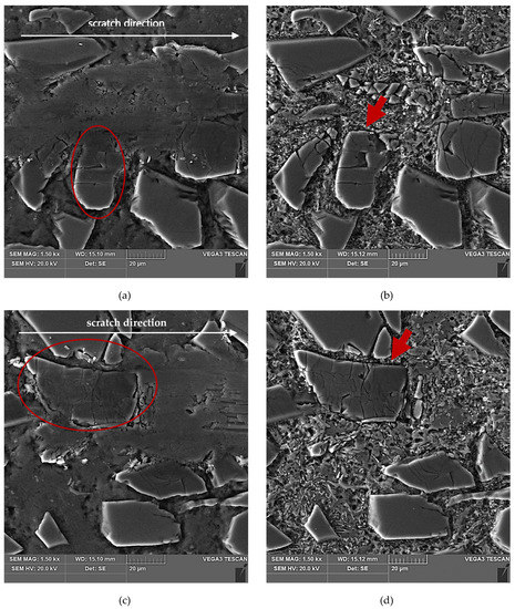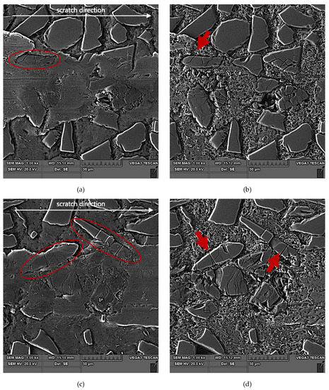 In scratch areas in which SiC particles are characterized with a lower length-to-width ratio (globular particles) and are oriented perpendicularly (Figure 14c and Figure 11b) or parallel to (Figure 14d and Figure 11d) the scratch direction, the patterns of the cracks’ nucleation and propagation are similar to those shown in Figure 14a,b. However, there is a difference consisting of the main cracks oriented parallel to the scratch direction, as in the case shown in Figure 14c, or the primary cracks oriented perpendicularly to the scratch direction as shown in Figure 14d. Additional cracks occur propagating in the direction perpendicular to the main cracks, and the effect of interaction with the diamond indenter is a development of a reticle of cracks.
