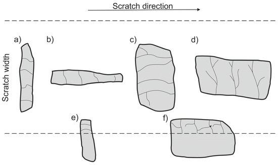 An analysis of the propagation of cracks resulting in the degradation of SiC particles due to operation of the diamond indenter indicates that the process of nucleation and propagation of crack of SiC particles is conditioned by their size, shape (geometry), and orientation relative to the scratching direction. The process is illustrated schematically in Figure 14. In the case of elongated SiC particles characterized with a high length-to-width ratio, the crack propagation direction depends on their orientation relative to the scratch direction. In case of a transversal orientation of the particles, the cracks are parallel to the scratch direction (Figure 14a and Figure 12d), and in case of a longitudinal orientation of the particles, the cracks are perpendicular to the scratching direction (Figure 14b and Figure 12b). That can be explained by an anisotropy of strength properties of the particles due to their geometry. In the case of particles oriented transversely to the scratch direction (Figure 14a), their shear strength is definitely lower in their transversal direction compared to their longitudinal direction. It can be concluded that in that case, shear stresses play the key role in SiCp degradation.