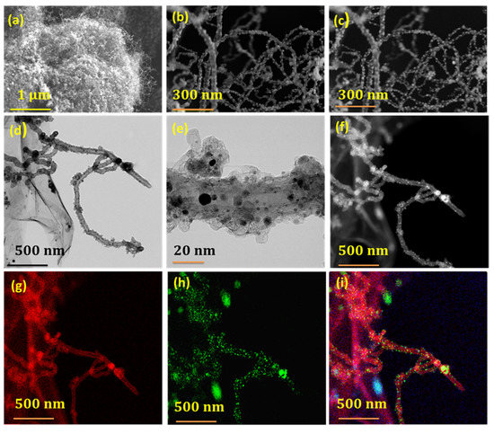 SEM micrographs at low and high magnification (a,b) and corresponding secondary electron image ((c)) of Fe@NCNT-rGO. TEM image at low (d) and high (e) magnification exhibiting predominant presence of iron nano-particles anchored on CNT; (f) shows high-angle annular dark-field (HAADF) image and its corresponding nitrogen (g), iron (h) and combined map (i).