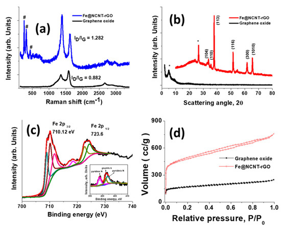 The Raman spectra of graphene oxide and Fe@NCNT-rGO (Figure 2a) measured at 514 nm excitation frequency shows three peaks at 226, 496, and 538 cm−1 that correspond to iron moieties in Fe@NCNT-rGO. These peaks are in addition to the widely known graphene related peaks: the Raman active G band peak at 1584 cm−1, which is due to the in-plane vibrational mode and the disorder induced 1352 cm−1 peak due to the presence of carbon nanotubes on the graphene substrate. The 2D peak occurring in the vicinity of ~2600 cm−1 is sharper in Fe@NCNT-rGO and it is related to sp2-carbon bonds combined with a minor hump that is associated with disordered carbon occurring at ~2400 cm−1 [25]. Another interesting observation is the decrease in the ID/IG ratio (ratio of intensities of D band to G band) from 0.882 in graphene oxide to 1.282 in Fe@NCNT-rGO, which proves that the defects generated on graphene oxide substrate during its synthesis are healed due to the growth of CNT. XRD was used to study the structure of graphene oxide and Fe@NCNT-rGO, wherein a single peak at the scattering angle of 2θ = 5.34 corresponding to d-spacing of 1.94 nm dominates the XRD plot of graphene oxides, whereas the diffraction pattern of Fe@NCNT-rGO is dominated by iron related peaks at 2θ values of 24.6 corresponding to crystalline carbon of CNT and at 33.7, 35.64, 37.95, 51.56, 61.62, and 65.5 corresponding to (104), (110), (1130, (116), (300), and (1010) of iron carbide and iron nitride moieties, which has been further confirmed from XPS studies [30].