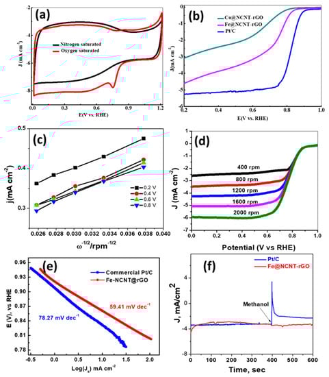 Figure 3a exhibits the electrochemical behavior of our newly developed vitamin B3 derived nitrogen doped CNTs on rGO were tested in nitrogen and oxygen saturated 0.1 M KOH electrolytes and the CV plot. Typical of Fe-N-C systems [36,37,38], the CV curve in oxygen saturated system shows a small hump at ~0.75V, whereas this hump is absent in nitrogen saturated electrolyte, which indicates the suitability of our Fe@NCNT-rGO for ORR type of reactions. A rotating disk electrode (RDE) was used to perform linear sweep voltammetry (LSV) in O2 saturated 0.1 M KOH electrolyte to measure the ORR activity and the kinetics of the Fe@NCNT-rGO, Co@NCNT-rGO, and commercially available Pt/C electrodes (Figure 3b). Amongst the three tested electrodes, Fe@NCNT-rGO exhibited outstanding electro-catalytic activity with a high onset potential of 0.96 V vs. RHE (reversible hydrogen electrode), which is close to that of commercial Pt/C catalyst. It can also be observed that both Fe@NCNT-rGO and Co@NCNT-rGO display slightly more positive half-wave potential (E1/2) of 0.87 V when compared to Pt/C (0.86 V). Even more, our Fe@NCNT-rGO exhibits slightly lower, but comparable, current density of 5.7 mA cm−2 when compared to the 5.9 mA cm−2 observed in commercial Pt/C electrodes. A diffusion controlled and effective four-electron ORR pathway can be inferred from the broad current plateau [39] that was observed in the region of 0.2 to 0.65 V. The RDE polarization curves were measured at increasing rotation speeds from 400 to 2000 rpm (plotted in Figure 3c) and the corresponding Koutecky–Levich (K–L) plots of the Fe@NCNT-rGO electrodes that are exhibited in Figure 3d show parallel linearity in the range of 0.2 to 0.65 V, validating the nearly first-order kinetics of the ORR reaction [40,41]. The number of electrons (n) transferred per oxygen molecule, as calculated by K-L equation, and was found to be around 4.0, which is close to the theoretical value of 4.0 for commercial Pt/C, which also reiterates our contention that four electron pathway is followed in our newly developed Fe@NCNT-rGO electrodes.