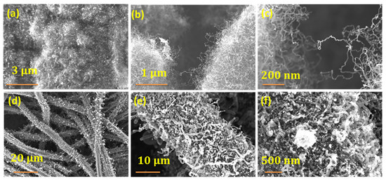 Representative SEM micrographs of Vitamin B3 derived nitrogen doped carbon nanotubes using cobalt catalyst (a–c) and CNTs grown on carbon fiber substrates (d–f).