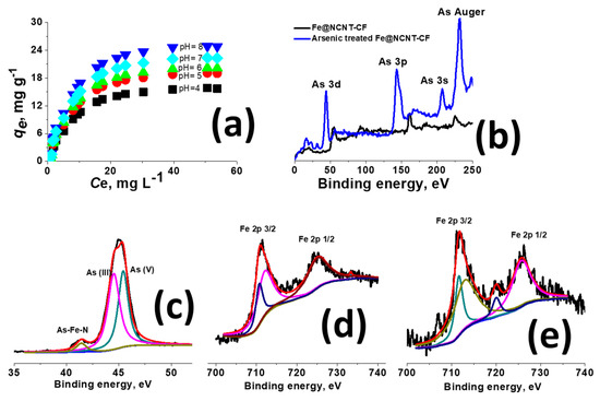 Adsorption isotherms of arsenic on Fe@NCNT-CF nanostructures at different pH values (a); Visible arsenic peaks at low binding energy of pristine and arsenic adsorbed Fe@NCNT-CF (b); deconvoluted spectra of As 3D (c); Deconvoluted Fe 2p spectra of Fe@NCNT-CF (d); and, arsenic adsorbed Fe@NCNT-CF (e).