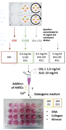 Human mesenchymal stromal/stem cells were resuspended into either growth medium with the addition of 10% FBS (GM) or the different conditioned media solutions that were prepared as described before with an appropriate cell density to obtain 500,000 hMSCs per IPN construct. The hydrogels were then cultured for either 1 (GM D1) or 21 days (GM D21, S-CM0.5, MA-CM0.5, and MA-CM5) in osteogenic medium (growth medium with the addition of 10% FBS and osteogenic factors) with a medium change twice a week. The complete experimental planning for this study is shown in Figure 1.
