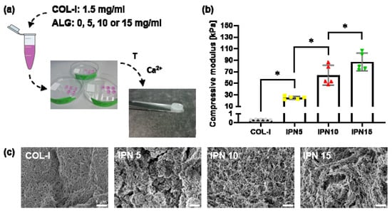 Fabrication of an IPN material mirroring the bone marrow/osteoid niche (a) Overview of the IPN synthesis with a 1.5 mg/mL collagen type I (COL-I) concentration and a varying alginate (ALG) concentration of 0, 5, 10, and 15 mg/mL subjected to a collagen type I gelation phase at 37 °C (T) for 30 min next to an ionic crosslinking (Ca2+) phase of alginate at 37 °C for 3 h; (b) unconfined compressive modulus compared for four different materials: a collagen type I hydrogel (COL-I), a COL-I/ALG IPN hydrogel with 5 mg/mL alginate (IPN 5), a COL-I/ALG IPN hydrogel with 10 mg/mL alginate (IPN 10), and a COL-I/ALG IPN hydrogel with 15 mg/mL alginate (IPN 15) (n = 5); (c) SEM images of COL-I, IPN 5, IPN 10, and IPN 15 (scale bar: 1 μm).