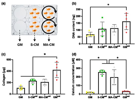 Effect of paracrine factors released by osteocytes on hMSC behavior in 2D cell culture. (a) Overview of the different media groups including growth medium (GM), conditioned medium collected from statically cultured osteocytes (S-CM) and conditioned medium collected from mechanically activated osteocytes (MA-CM); (b) quantification of the DNA content through a picogreen dsDNA kit for hMSCs treated with GM, S-CMost, MA-CMost, and the growth medium group supplemented with osteogenic factors (GMost) (n = 5); (c) quantification of collagen deposition through the amount of bound picrosirius red staining for each medium group (n = 5); (d) quantification of mineral deposition through the amount of bound alizarin red staining for every medium group (n = 5).