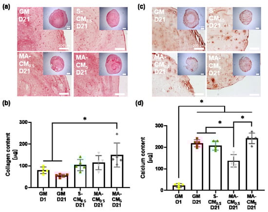 Either after 1 or 21 days, the osteogenic media was removed and the IPN was washed with PBS. The materials for biochemical assessment were cut in two and put into 1.5 mL microtubes for either papain or hydrochloric acid digestion. These microtubes were then stored overnight at −80 °C. The histology samples were fixed with 4% PFA for 4 h, dehydrated in 30% EtOH, and stored in 50% EtOH.