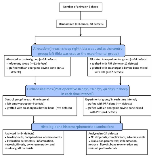 This study aims to histologically evaluate the hard tissue healing of bone defects filled with platelet-rich fibrin (PRF) alone or as an adjuvant for mixing and covering anorganic bovine bone (ABB), compared to ABB covered with a resorbable collagen membrane (CM), in the early and late periods. The healing process of the bone defects created in sheep was histologically and histomorphometrically observed post-operatively at days 10, 20, and 40 in a crossover trial. A clinical study was conducted to test the following null hypothesis: using PRF alone or with different grafting materials and resorbable membranes in the treatment of bone defects do not yield a statistically significant difference in terms of inflammation, new bone area and residual graft area.