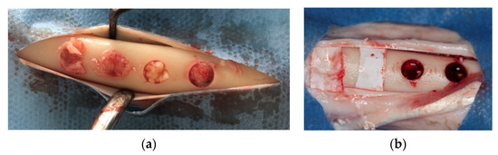 Skin and periosteal incisions were performed on left and right tibia to achieve surgical field exposure. Four 5-mm diameter defects, 5-mm apart from each other, were created using a calibrated 5 × 22 mm trephine bur (Salvin Dental Specialties, Inc., Charlotte, NC, USA) to a depth of 5 mm, using a physiodispenser at 1500 rpm and under cold saline irrigation. The whole superficial cortical plate was removed. Randomly, two of the defects created on the right tibia (control) were left empty, and the other two were grafted with an anorganic bovine bone (Bio-Oss, Geistlich PhaRMA, Wolhusan, Switzerland) and then covered with a resorbable collagen membrane (Bio-Gide, Geistlich PhaRMA). On the left tibia (test), two defects were filled with PRF alone whereas the other two were filled with anorganic bovine bone (Bio-Oss, Geistlich PhaRMA, Wolhusan, Switzerland) mixed with PRF, and covered with a PRF membrane (Figure 2a,b). The subcutaneous tissue was closed with 2.0 resorbable sutures (Vicryl, Ethicon Inc., New Jersey, USA) and the skin was closed with skin stapler.