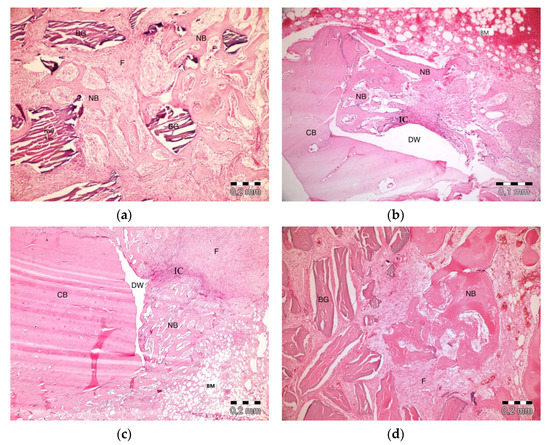 Histologic findings on the 10th day. (a): platelet-rich fibrin (PRF) + anorganic bovine bone (ABB); (b): PRF; (c): Empty Defect; (d): ABB + collagen membrane (CM). N: New bone area; F: Fibrosis; BG: Bone graft; DW: Defect wall; CB: Compact bone; BM: Bone marrow; IC: inflammatory cells infiltration.