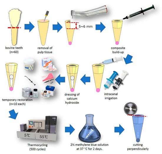 The outline of this study is schematically shown in Figure 1. Sixty bovine mandibular incisor teeth (Yokohama Meat Corporation, Yokohama, Japan), which were frozen immediately after removal, were defrosted using running tap water immediately before use. After removing the periodontal tissue adhering to the bovine teeth, they were cut about 5 mm above the cemento-enamel junction, and the pulp tissue in the root canal was removed with a #80 K-file (Mani, Utsunomiya, Japan). Next, the mesial or distal half of the tooth stump was removed to prepare 5–6 mm steps using a diamond bur (Mani Dia-bur TF114, Mani, Utsunomiya, Japan) mounted on a high-speed micro motor handpiece (Ti-Max X 95, NSK, Kanuma, Japan). Self-etching primer and bonding resin (Clearfil Megabond 2, Kuraray Noritake Dental, Tokyo, Japan) was applied according to the manufacturers recommendations, light-cured with an LED light-curing unit (Demi Plus, Kerr, Orange, CA, USA), and a flowable resin composite (Tokuyama Estelite Universal Flow Quick Super Low A2, Tokuyama Dental, Kamisu, Japan) was built up to restore the missing portion of the tooth stump. After correction of the cavity wall shape using a diamond bur, the apex and its periphery were sealed with a self-curing acrylic resin (Unifast III, live pink, GC, Tokyo, Japan).