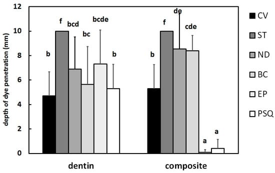 Depth of dye penetration in each group. Data are shown as the mean ± S.D. (n = 10); values, with the same letter indicating that there is no significant difference between the groups (p < 0.05). CV, Caviton EX (GC); ST, Temporary Stopping (GC); ND, Neodyne-α (Neo Dental Chemical Products); BC, Shofu Base Cement (Shofu); EP, Evadyne Plus (Neo Dental Chemical Products); PSQ, Nishika Plast Seal Quick (Japan Dental Pharmaceutical Manufacturing).